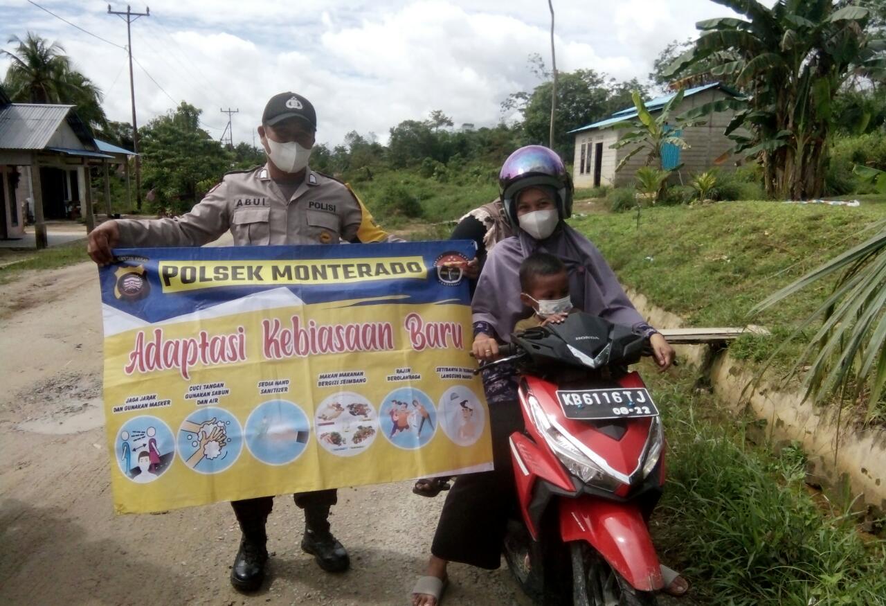 Menemui warga di jalan Dusun Karya Desa Monterado Bripka Abui menyampaikan imbauan dan sosialisasikan protokol kesehatan 5M yaitu menjaga jarak, memakai masker, mencuci tangan dengan sabun, mengurangi mobilitas dan menghindari kerumunan.