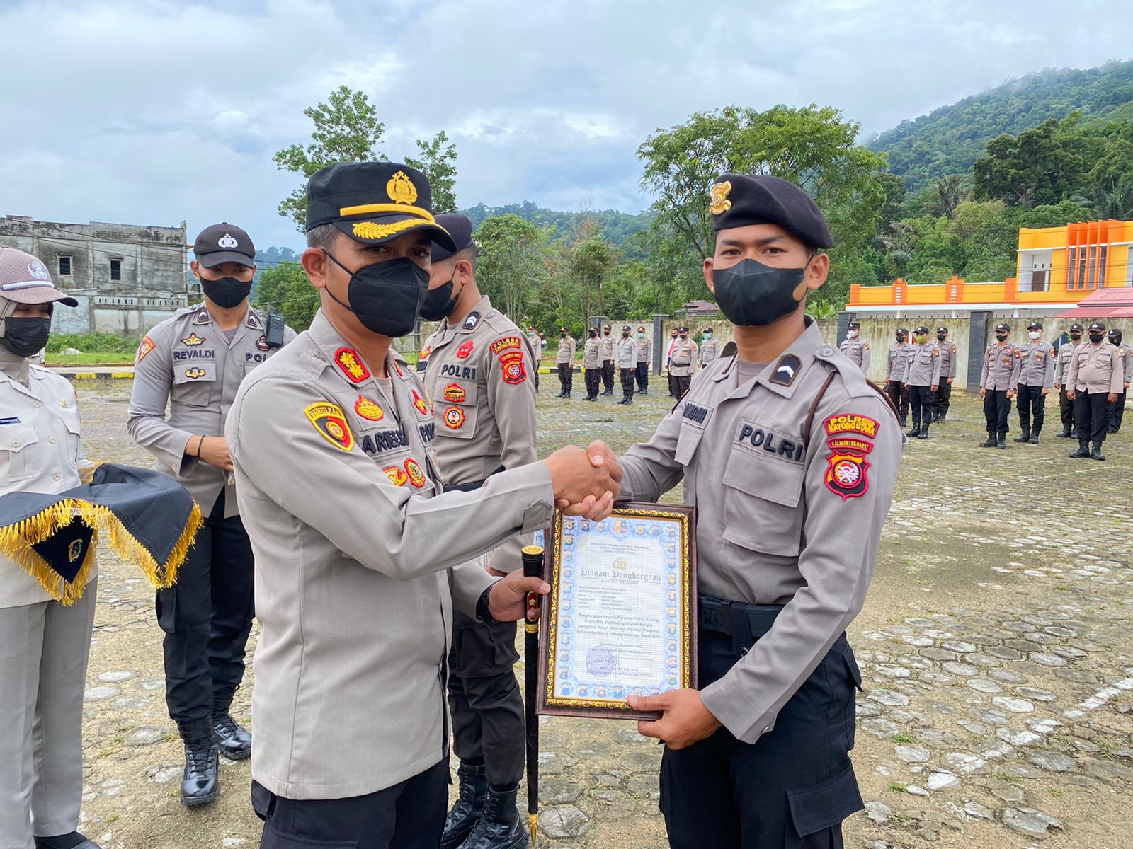 Kayong Utara – Kapolres Kayong Utara AKBP Arief Hidayat, S.H., S.I.K memberikan penghargaan kepada personel Polres Kayong Utara yang berprestasi, dalam sebuah upacara di halaman Mapolres Kayong Utara, Senin (05/12/2022).