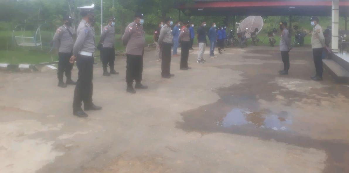polres bengkayang, Kapolsek jagoi babang AKP Andri syahroni, S.I.P,M.M saat melaksanakan apel pagi di mako polsek jagoi babang menyampaikan arahannya kepada personil polsek jagoi babang agar disiplin dalam menerapkan protokol kesehatan untuk mencegah penularan covid 19