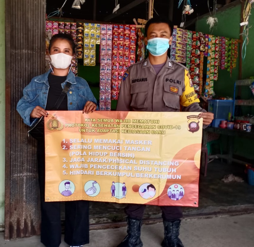 Polres Bengkayang, Polsek Monterado- Bhabinkamtibmas Desa Jahandung Bripka Suprianus gunakan banner berikan Himbauan 5M ke warga binaan di Desa Jahandung guna mencegah penyebaran Covid-19, Selasa (15/06/2021).
