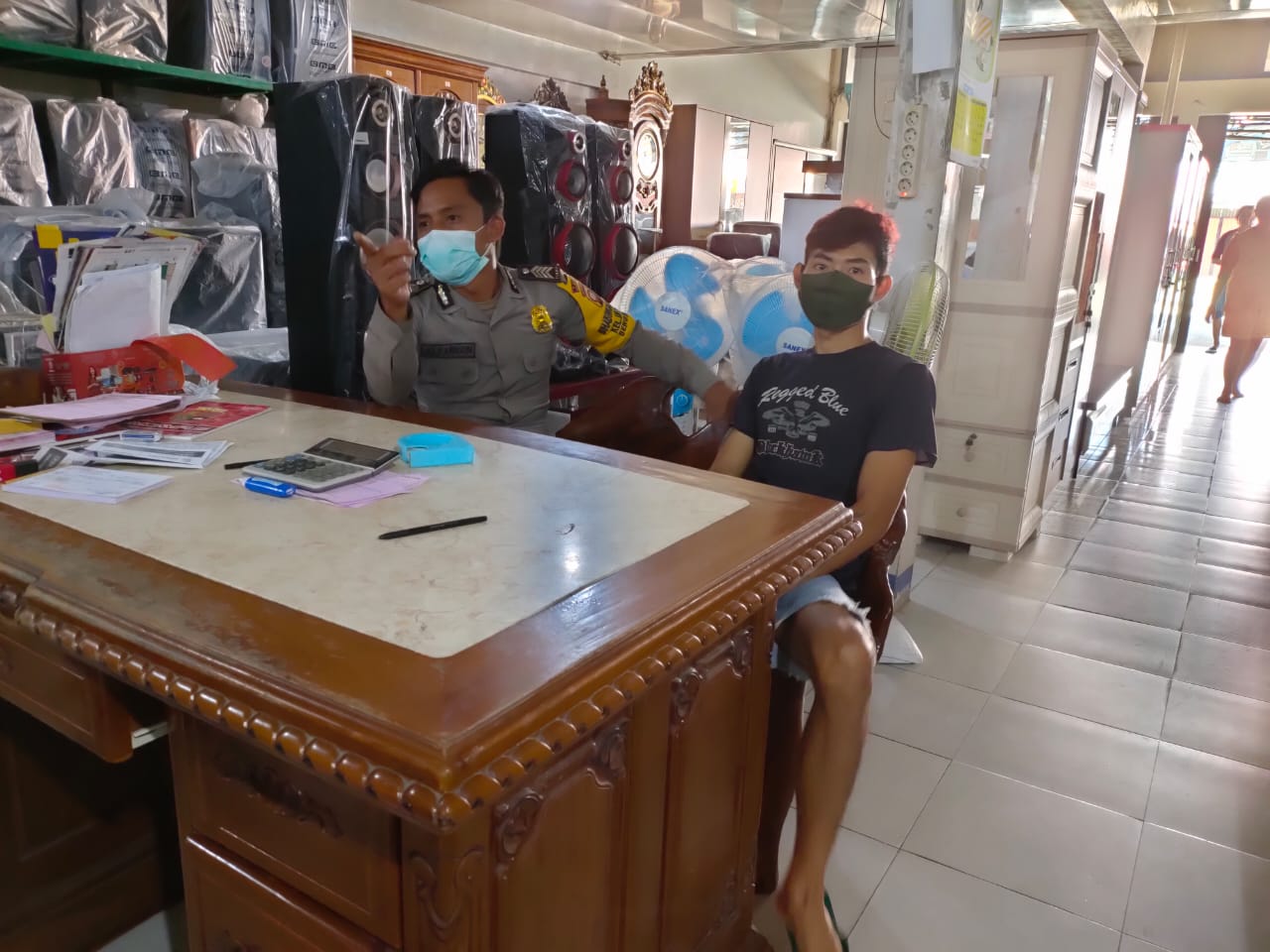 Pada saat melaksanakan sambang dan bertatap muka dengan Karyawan toko, Bhabinkamtibmas Kel.Bumi Emas Bripka Julkarnain menyampaikan beberapa hal guna mencegah penyebaran virus corona kepada karyawan.