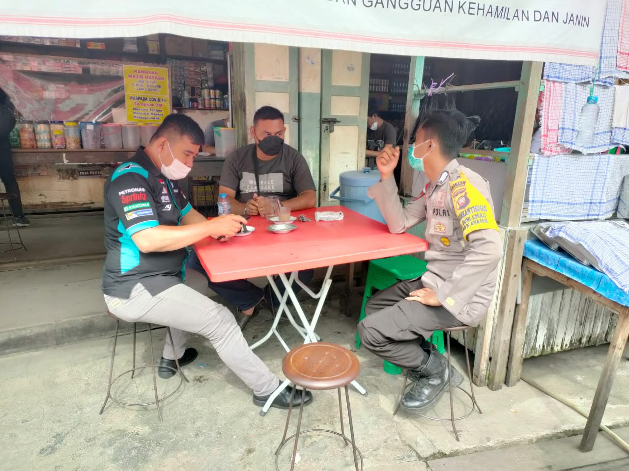Bhabinkamtibmas Kelurahan Bumi Emas Polsek Bengkayang Polres Bengkayang Bripka Julkarnain melaksanakan sambang dan patroli wilayah Binaannya dalam rangka menjaga situasi keamanan dan ketertiban masyarakat tetap aman dan kondusif. Dalam kesempatan kali ini, Bripka Julkarnain laksanakan sambang sekaligus melakukan himbauan protokol kesehatan kepada pemilik warung Kopi dan pengunjung , di Jln.Tabrani Kelurahan Bumi Emas Kec.Bengkayang Kab. Bengkayang. Rabu (21/07/2021).