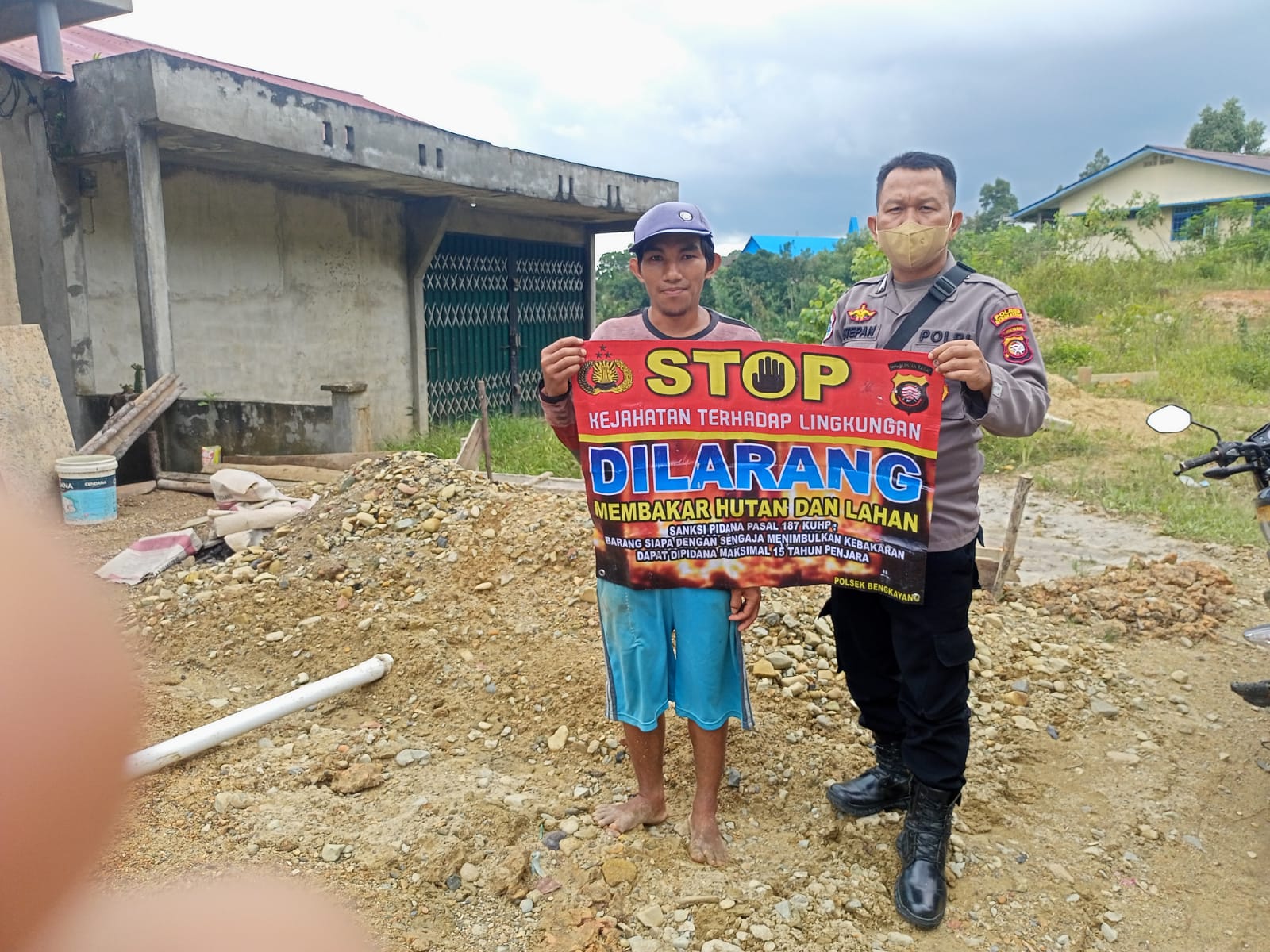 Peran Bhabinkamtibmas bersama warganya sosialisasi dan membentangkan banner, sekaligus menghimbau warga tidak melakukan pembakaran hutan dan lahan.