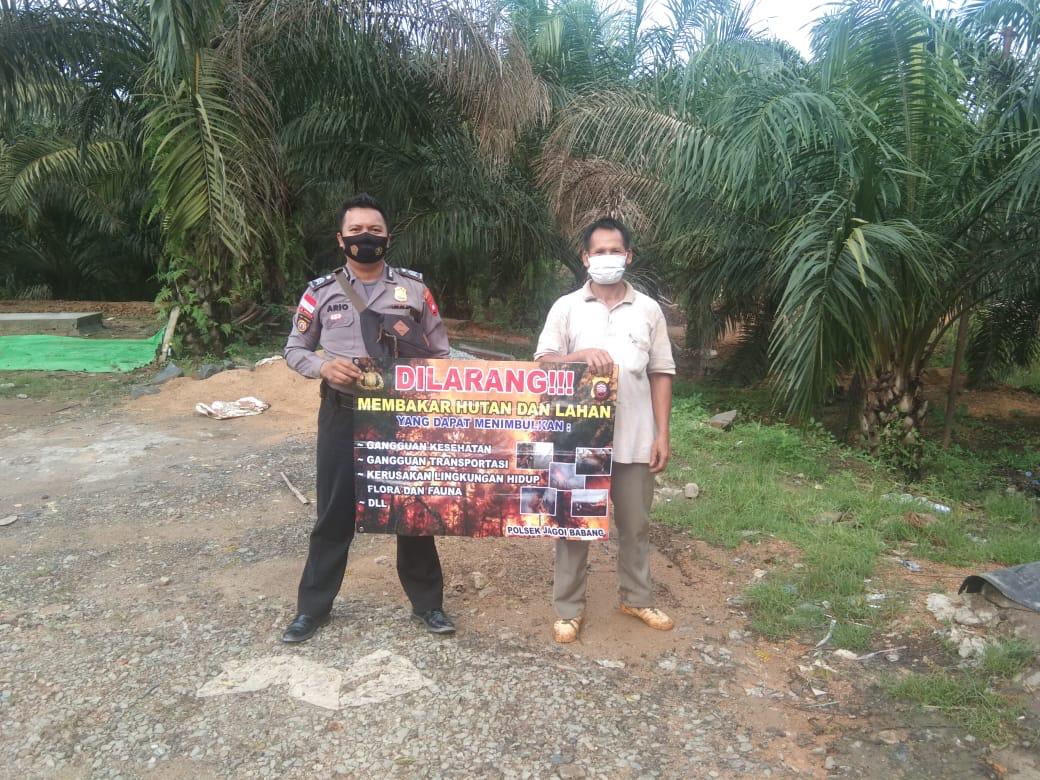 polres bengkayang,polsek Jagoi babang-Membawa banner karhutla babinkamtibmas desa semunying jaya brigadir ario menyambangi warga di desa binaannya dan menyampaikan imbauan serta sosialisasikan larangan membakar hutan dan lahan