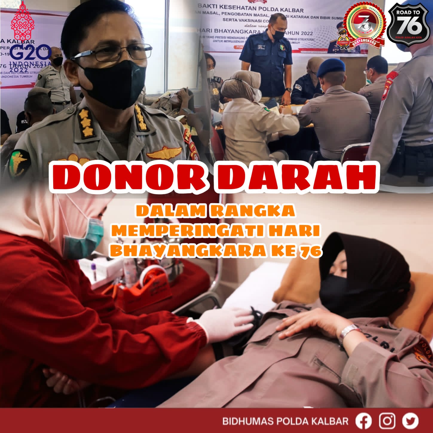Kabiddokkes Polda Kalbar Kombes Pol Waloejo Noegroho menjelaskan bahwa menyambut Hari Bhayangkara ke-76, kita melakukan aksi donor darah secara serentak di seluruh jajaran Polda, khususnya Polda Kalbar sesuai arahan bapak Kapolri.