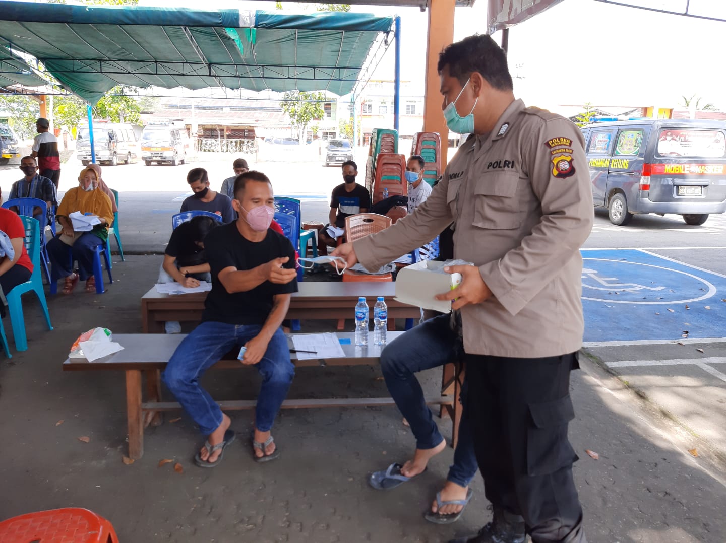 “Bentuk kepedulian kepada masyarakat khususnya yang melaksanakan vaksin anggota binmas membagikan masker kepada masyarakat bengkayang supaya selalu menjaga protokol kesehatan dengan selalu memakai masker ungkap “Bripka.Hendra