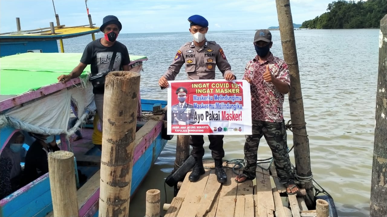 Upaya mencegah dan memutus rantai penyebaran Covid-19, Sat Pol Air Polres Bengkayang Polda Kalbar tetap menjalankan Penerapan Protokol Kesehatan kepada semua warga yang datang ke Penyeberangan Umum Dsn. Teluk Suak Ds. Karimunting Kec. Sui Raya Kepulauan Kab. Bengkayang, Senin 1 November 2021.