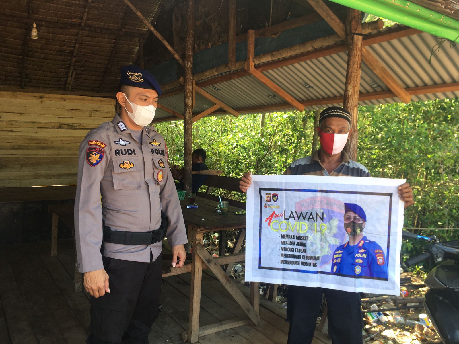 Berbagai upaya mencegah dan memutus rantai penyebaran Covid-19 di Wilayah Pesisir Bengkayang yang terus menerus di lakukan oleh Sat Pol Air Polres Bengkayang Polda Kalbar, dalam bentuk Imbauan personel Sat Pol Air mengajak agar masyarakat tetap menjalankan Protokol Kesehatan Covid 19 di mana pun berada, seperti halnya Imbauan yang di laksanakan oleh Bripka Rudiansyah di Penyeberangan Umum Dsn. Teluk Suak Ds. Karimunting Kec. Sui Raya Kepulauan Kab. Bengkayang, Senin 20 Desember 2021, sekira pkl. 09.30 Wib.