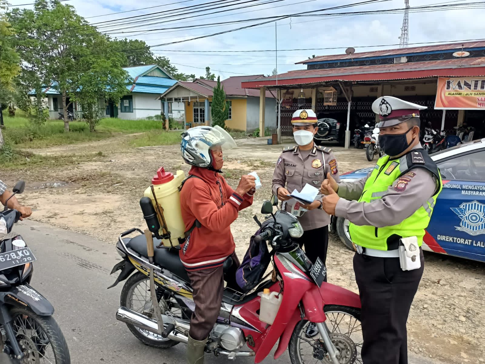 Bengkayang – Satlantas Polres Bengkayang menggelorakan edukasi protokol kesehatan dan membagikan masker kepada masyarakat, kali ini yang menjadi sasaran adalah masyarakat pengguna jalan pengguna kendaraan bermotor.