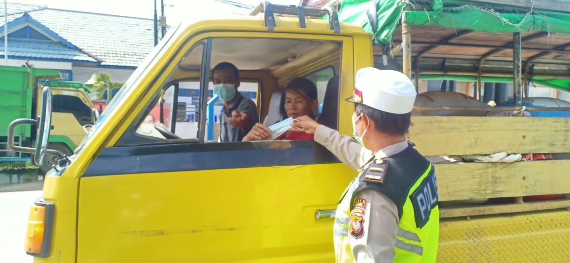Terpantau personel Satlantas Polres Bengkayang membagikan masker gratis kepada para masyarakat di Depan Pos Lantas Jalan Perwira Bengkayang.