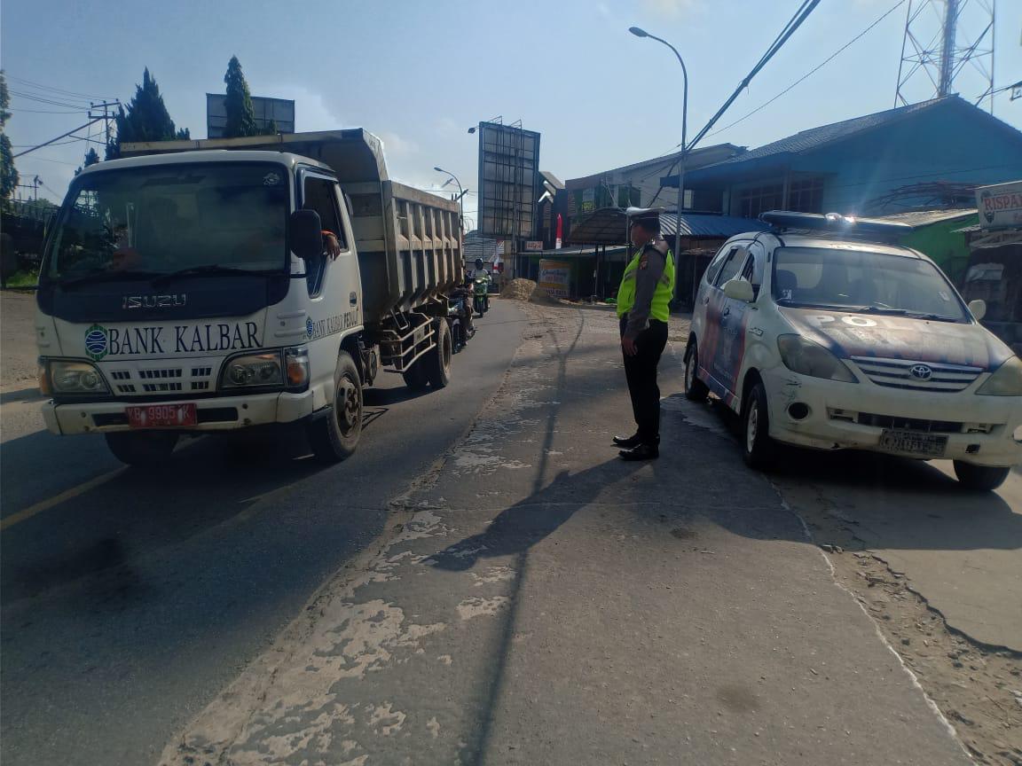 Bripka Ahjanu dan Brigadir Yeyeh melaksanakan pengaturan lalu lintas di jalan Perwira Bengkayang dengan tujuan untuk menjaga keselamatan masyarakat yg menyebrang jln dari kecelakaan lalu lintas.