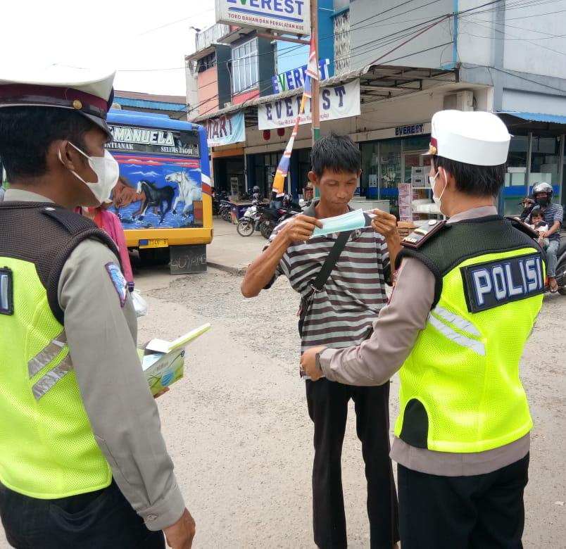 Polres Bengkayang- Salah satu kegiatan Kanit Dikmas Lantas Polres Bengkayang dan anggota dalam rangka Pencegahan penyebaran Covid 19 bagi masyarakat Bengkayang di hari libur yaitu melakukan Pembagian masker gratis kepada masyarakat yang tidak menggunakan masker di Pasar Bengkayang.