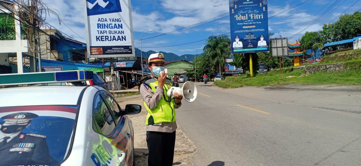 Bengkayang – Kanit Dikmas Lantas Polres Bengkayang beserta anggota mengimbau dan mensosialisasikan kepada masyarakat pengguna jalan melalui penerangan keliling di Jalan Perwira Depan Pos Lantas Bengkayang untuk mematuhi peraturan lalu lintas dan menerapkan protokol kesehatan guna mencegah penularan Corona Virus Disease (Covid-19). Selasa (29/06/2021 ).