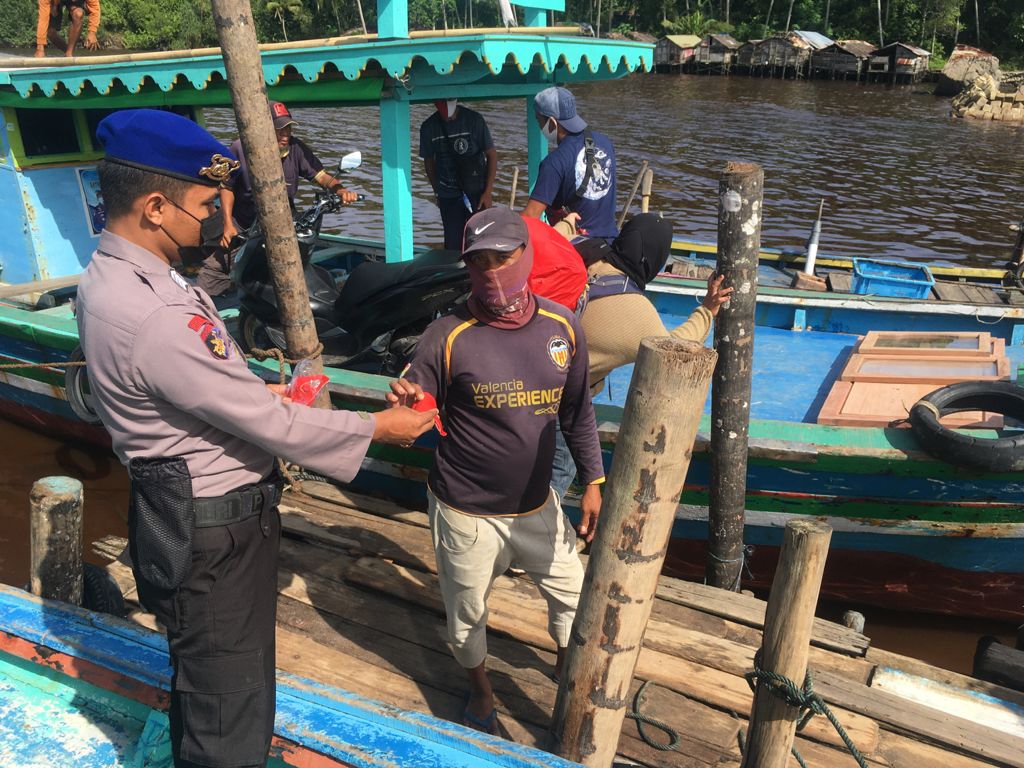 Personil Satpolair Polres Bengkayang Brigadir Sakalillah memberikan Imbauan kepada masyarakat yang tidak menggunakan masker untuk mematuhi segala peraturan yang di keluarkan oleh Pemerintah dan langsung membagikan masker kepada masyarakat yang tidak menggunakan masker.