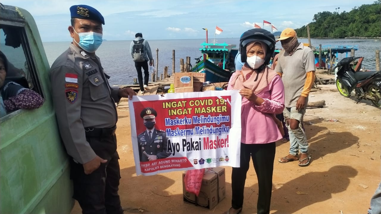 Personil Satpolair Polres Bengkayang Brigadir Sakalillah memberikan Imbauan kepada masyarakat yang tidak menggunakan masker untuk mematuhi segala peraturan yang di keluarkan oleh Pemerintah dan langsung membagikan masker kepada masyarakat yang tidak menggunakan masker.