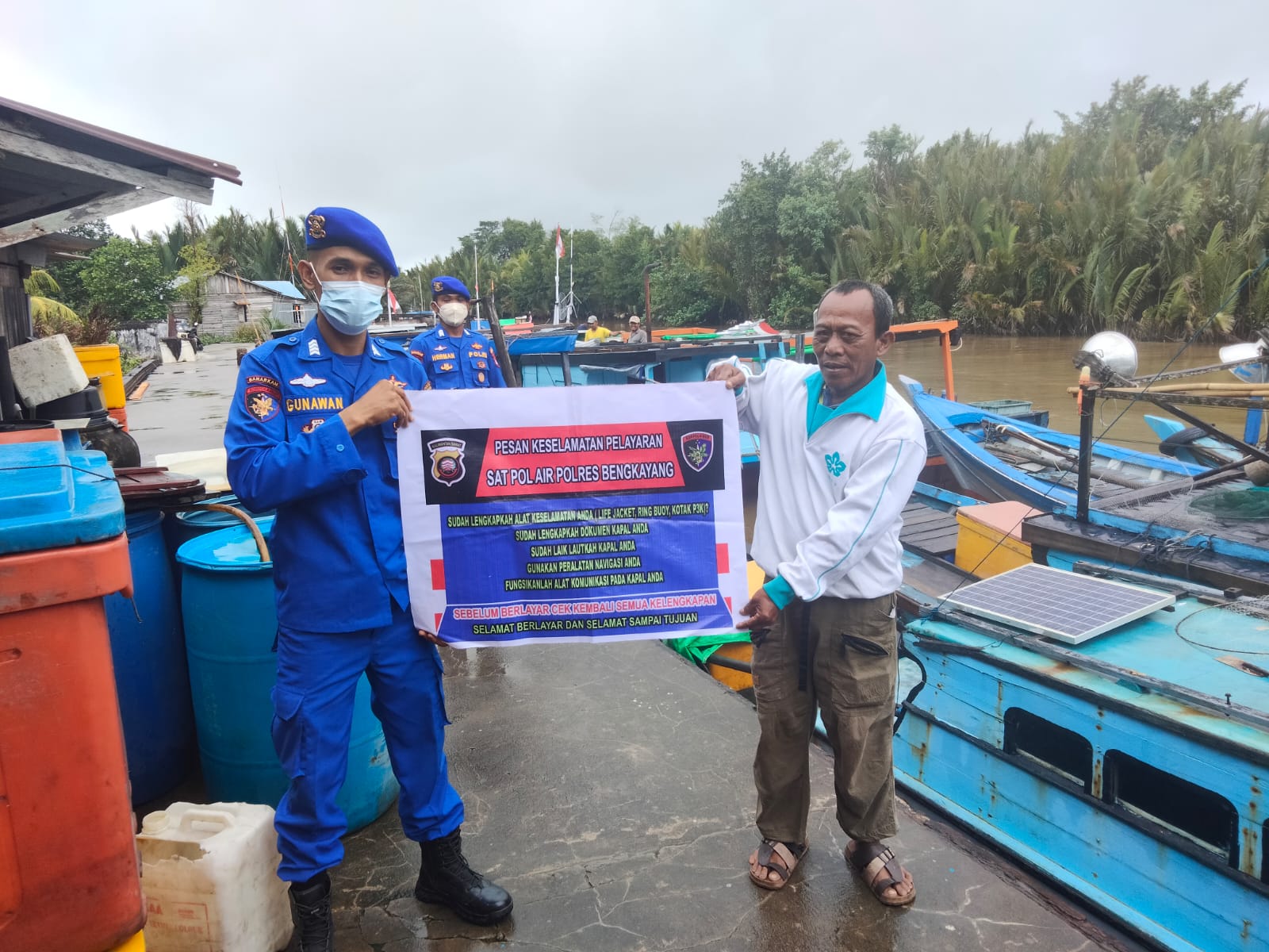 Melihat kondisi cuaca yang tidak menentu Personel Satpolairud Polres Bengkayang menyampaikan himbauan tentang cuaca ekstrim, gelombang tinggi dan angin kencang pada masyarakat di Dermaga Sungai Duri, Kecamatan Sungai Raya, Kabupaten Bengkayang, Jumat (24/12/2021).