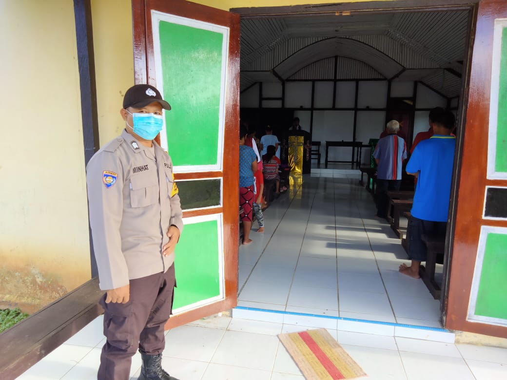 Polsek Siding Polres Bengkayang, Salah satu cara menjamin rasa aman dalam melaksanakan ibadah Minggu, Personil Polsek Siding Bripka Minhat melaksanakan pengamanan Gereja di Kecamatan Siding, Minggu (20/06/2021).