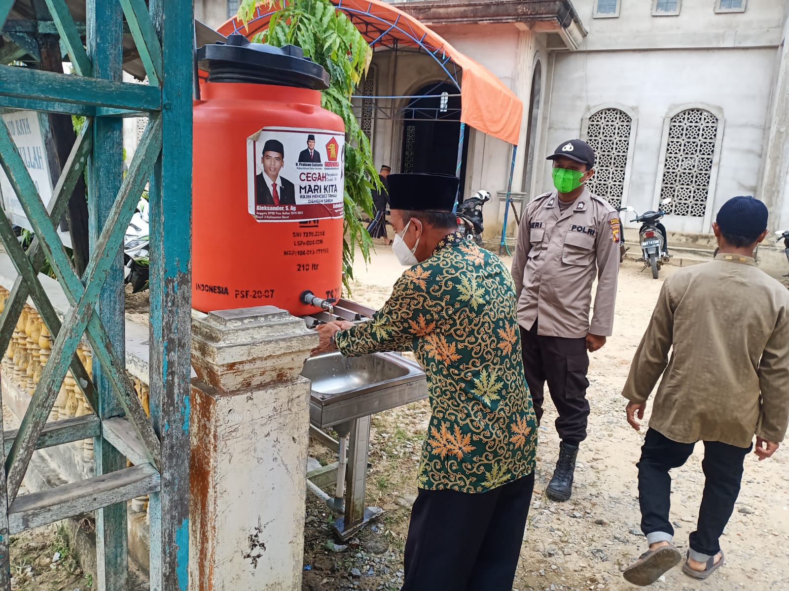 Polres Bengkayang, Polsek Monterado- Personel Polsek Monterado Briptu Heri terus disiplinkan Protokol Kesehatan 5M ke warga muslim saat pelaksanaan giat sholat jumat di Mesjid Rahmatullah, salah satunya mencuci tangan di tempat pencucian yang telah disediakan, Jumat(24/09/2021).