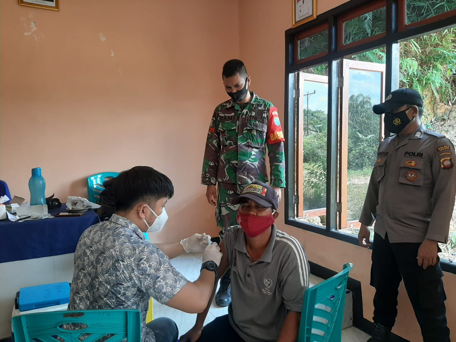 Personil Polsek Ledo bersama personil Koramil Ledo ( Babinsa ) Kec. Ledo selalu bersinergitas dalam melakukan pelayanan terhadap masyarakat hal ini di tunjukan dalam kegiatan pengamanan dan pendampingan vaksinasi warga desa Semangat Kecamatan bersama Babinkamtibmas dan Babinsa dengan mendampingi Pelaksanaan vaksinasi Covid 19 terhadap warga Binaannya di Balai desa Semangat Kec. Ledo Kab. Bengkayang pada Jum’at (08/10/2021).
