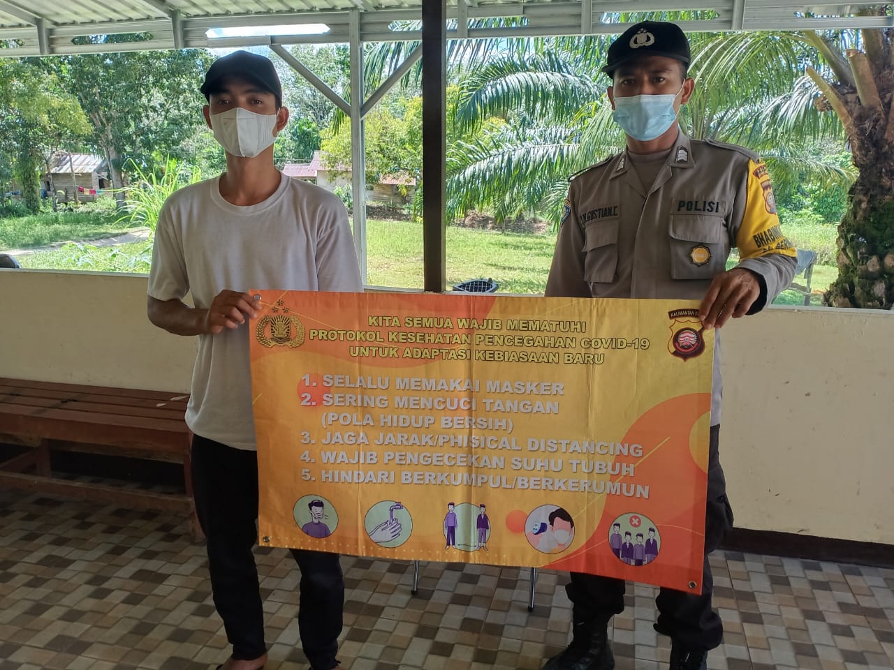 Personel Polsek Monterado Brigadir I.Nyoman Gustian ke warga yang temui nya agar menerapkan Protokol Kesehatan dengan menggunakan banner 5M yaitu memakai masker, menjaga jarak, mencuci tangan, mengurangi mobilitas dan menghindari kerumunan.