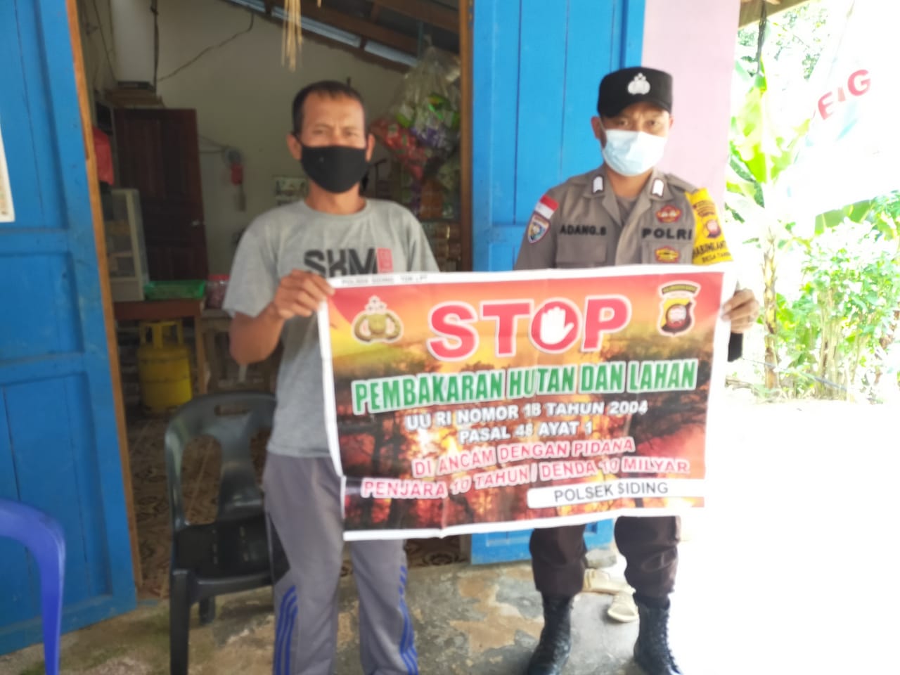 Kapolsek Siding Ipda Bambang Rudiyanto melalui Bripka Adang, menjelaskan rutin melaksanakan himbauan dan sosialisasi kepada masyarakat tentang pencegahan kebakaran hutan dan lahan.