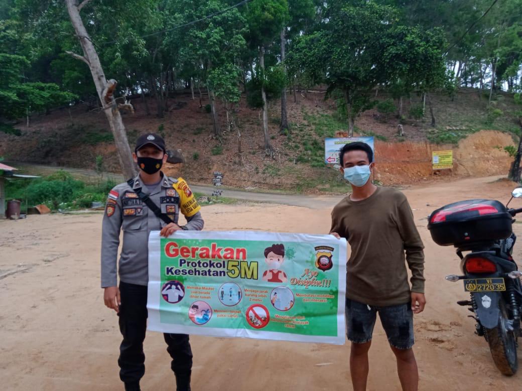 Guna mensosialisasikan dan menghimbau protokol kesehatan Bripda Aditya Haikal Salam selaku anggota Polsek Sungai Raya Kepulauan melaksanakan himbauan dan serta mensosialisasikan protokol kesehatan menggunakan banner kepada warga Tanjung Gundul dengan merangkul dan bekerjasama agar selalu menerapkan protokol kesehatan Covid-19 Rabu Pagi (23/06/2021).