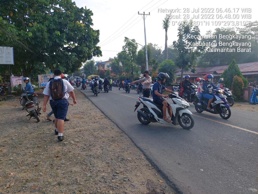 Strong point ini dilaskanakan oleh sejumlah anggota Polsek Bengkayang. Mereka membantu anak sekolah menyebrang dan melakukan pengaturan lalu lintas guna mencegah fatalitas.
