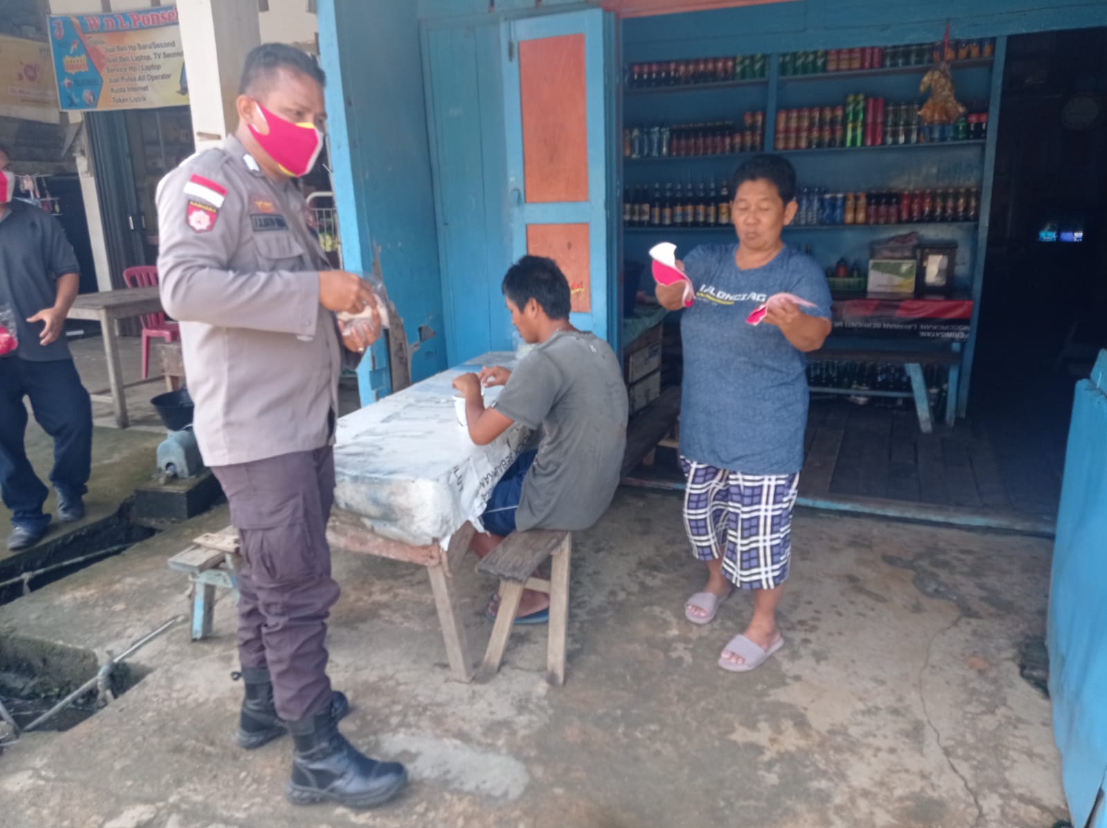 Polres Bengkayang – Polsek Samalantan. Anggota Polsek Samalantan Polres Bengkayang, Bripka Ferry Stepenson berupaya menekan penyebaran Covid 19 dengan membagikan masker ke masyarakat, Jumat (13/8/2021) pagi.