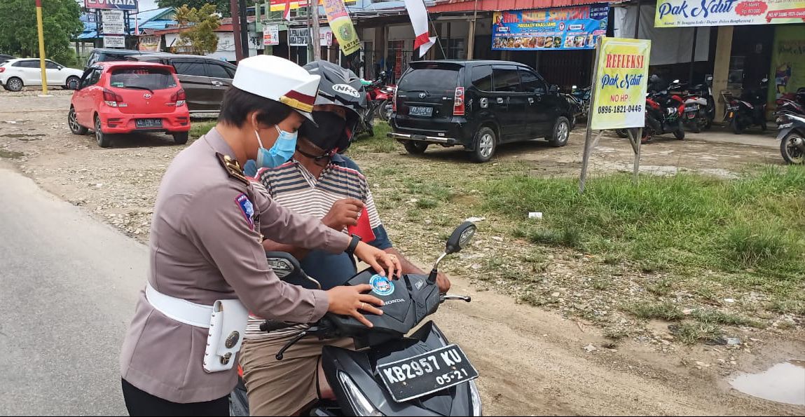 Selain memberikan masker secara gratis, pihaknya juga melaksanakan penempelan stiker kepada para pengendara yang melintas di Depan Mapolres Bengkayang.