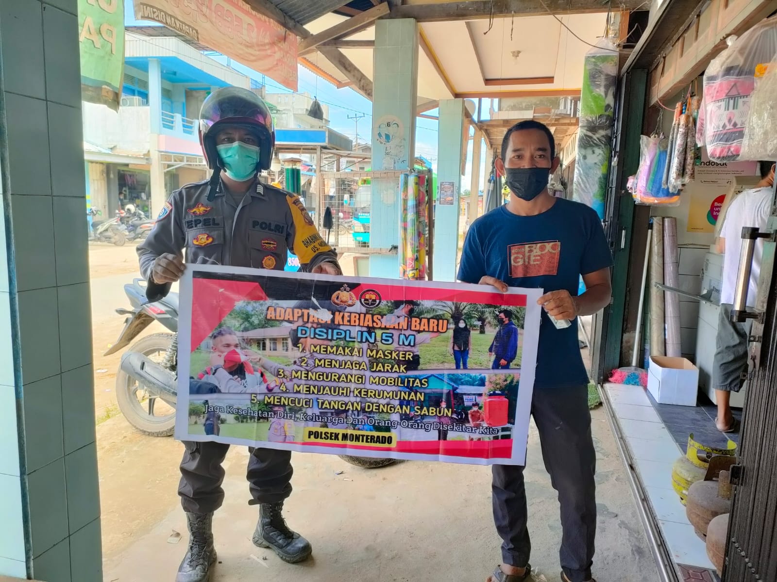 Terlihat Bhabinkamtibmas Desa Monterado Bripka Pepel menyampaikan langsung banner Prokes 5M ke warga binaan agar warga memahami pentingnya menerapkan Protokol Kesehatan 5M ditengah pandemi Covid19 ini, Kamis (27/01/2022).