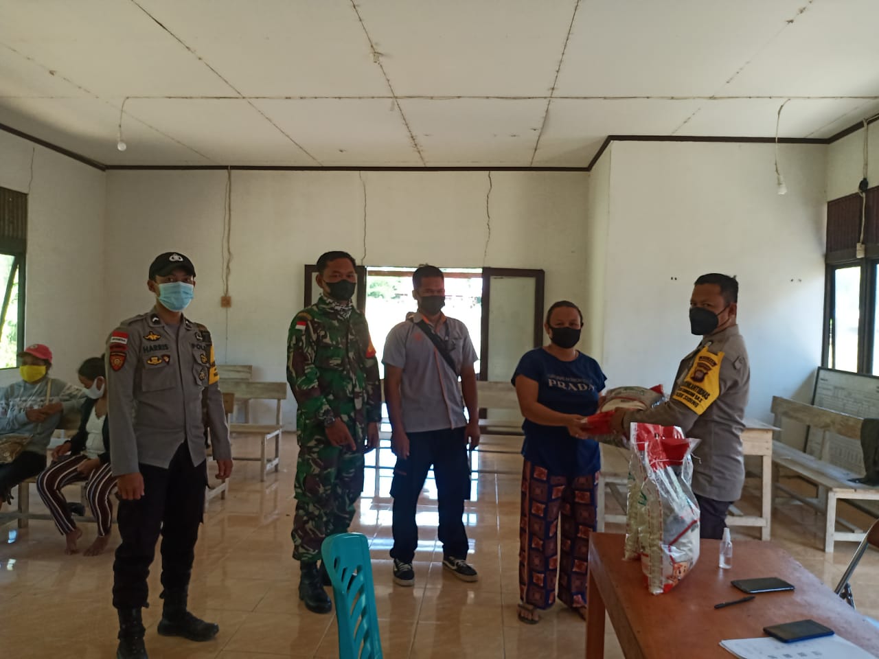 Personil Polsek Siding dan Anggota Koramil Jagoi Babang melakukan pengamanan pada penyaluran beras bantuan PPKM 2021 di Aula Kecamatan Siding Kabupaten Bengkayang, Senin (09/08/2021) sekitar pukul 09.00 wib s/d Selesai.