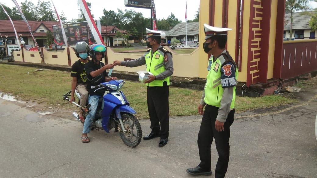 Terpantau personel Satlantas Polres Bengkayang membagikan masker gratis kepada para masyarakat di Depan Polres Bengkayang Jalan Sanggau Ledo Bengkayang.