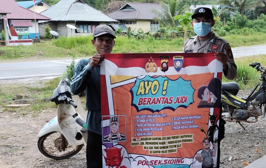 Pada saat personel Polsek Siding Polres Benkayang Polda Kalbar Bripka Nandang lakukan patroli dialogis menemui bahkan kunjungan kermh warga guna menyampaikan pesan-pesan Kamtibmas baik itu informasi dan Himbaun menggunakan media Benner “Ayo Berantas Judi”.