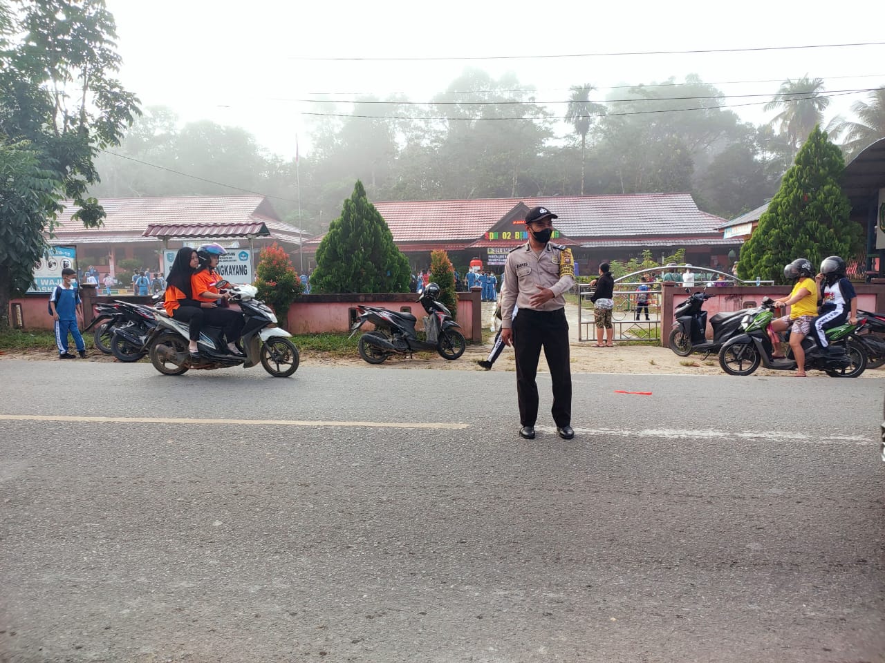 Anggota Polsek Bengkayang Polres Bengkayang Polda Kalbar melaksanakan strong point Pagi dan pengaturan lalu lintas serta stasioner guna mencegah kemacetan, kecelakaan lantas, dan antisipasi kriminalitas. Strong Point Pagi dilakukan pada titik-titik keramaian serta rawan laka di jalan raya Sanggau Ledo tepatnya di depan SDN 02 Bengkayang. Senin (18/07/2022)