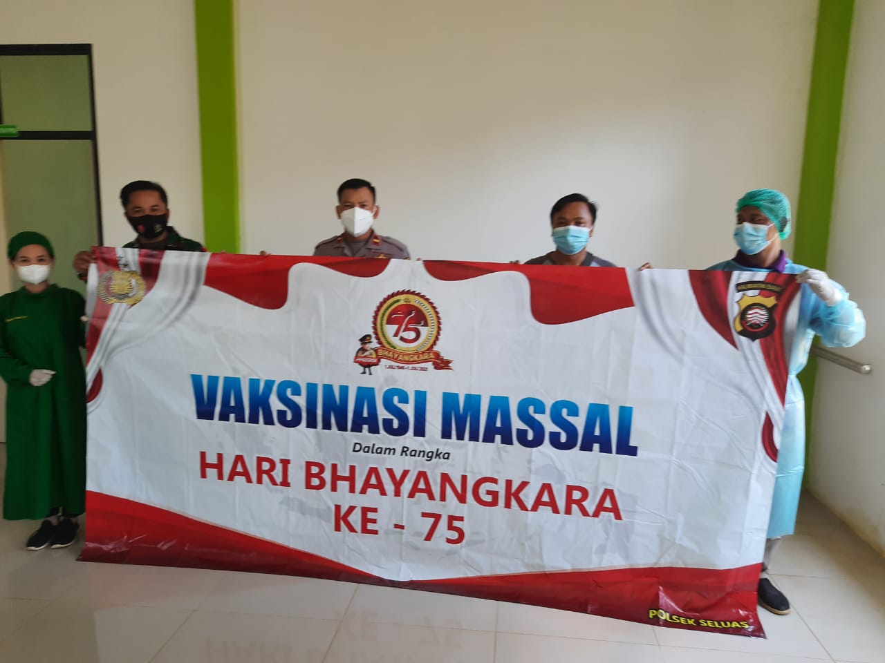 Sabtu tanggal 26 Juni 2021 Sekira pukul 08.00 Wib bertempat di Puskesmas Seluas Dusun Pejampi Desa Mayak Kecamatan Seluas Kabupaten Bengkayang telah dilaksanakan kegiatan Vaksinasi Covid-19 Dalam Rangka HUT BHAYANGKARA KE 75 KEPOLISIAN REPUBLIK INDONESIA mengadakan Vaksin Gratis untuk masyarakat, penyuntikan Dosis Ke I.
