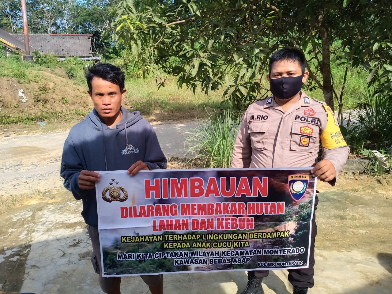 Polres Bengkayang, Polsek Monterado-Bhabinkamtibmas Polsek Monterado Brigadir Albertus Rio dalam rangka mencegah terjadinya kebakaran hutan dan lahan (Karhutla) di Desa binaan membentangkan banner berisikan himbauan larangan membakar hutan dan lahan.